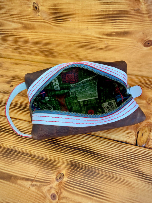 Kaiju Cut and Sew Brown Horween Leather Dopp Kit with Japanese Fabric liner | Handmade in Austin, Texas
