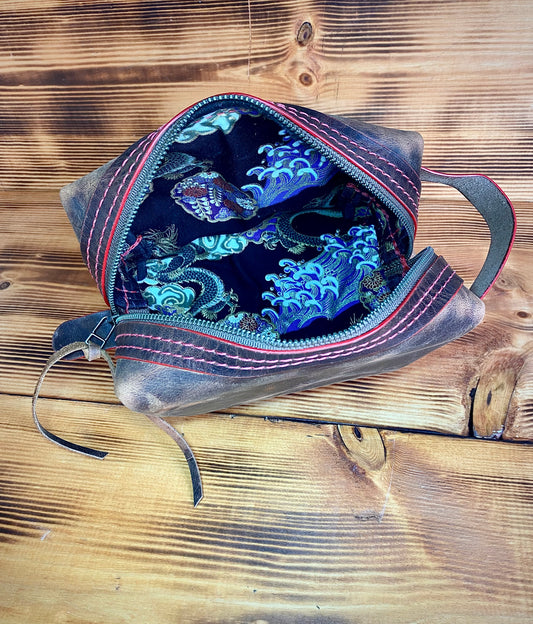 Kaiju Cut and Sew Rustic Horween Leather Dopp Kit with Black Dragon’s Japanese Fabric liner | Handmade in Austin, Texas