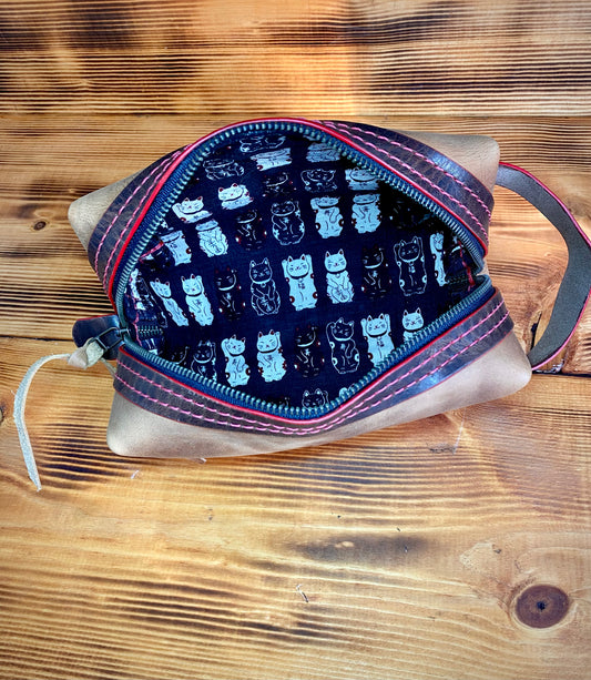 Kaiju Cut and Sew Brown Horween Leather Dopp Kit with Black Maneki Neko Japanese Fabric Liner | Handmade in Austin, Texas