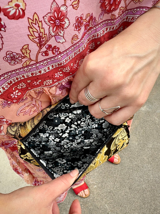 Kaiju Cut and Sew | Black and Gold Dragons Kimono Fabric Fanny Pack with built in 6 card slot wallet