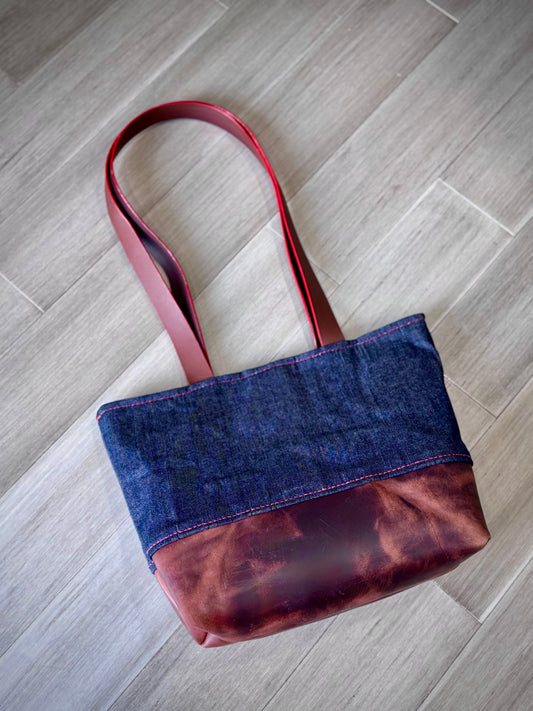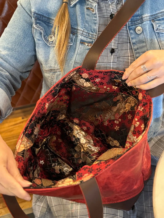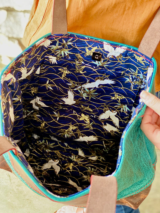 Kaiju Cut and Sew Large Leather Tote Bag | Japanese Kimono Fabric Interior | Handmade in Austin, Texas