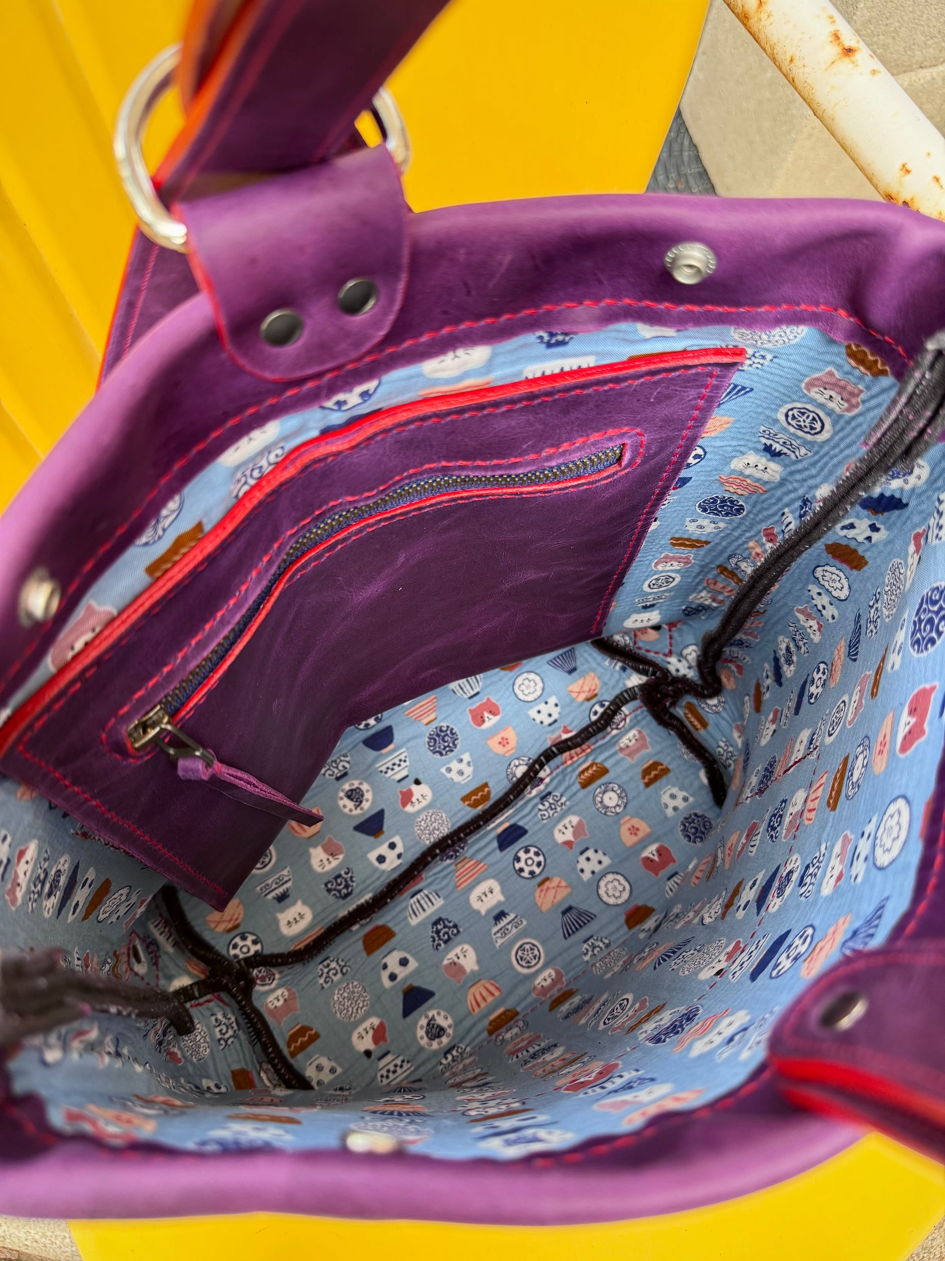 Kaiju Cut and Sew Backpack | Purple Horween Leather & Japanese Fabric Interior | Handmade in Austin, Texas