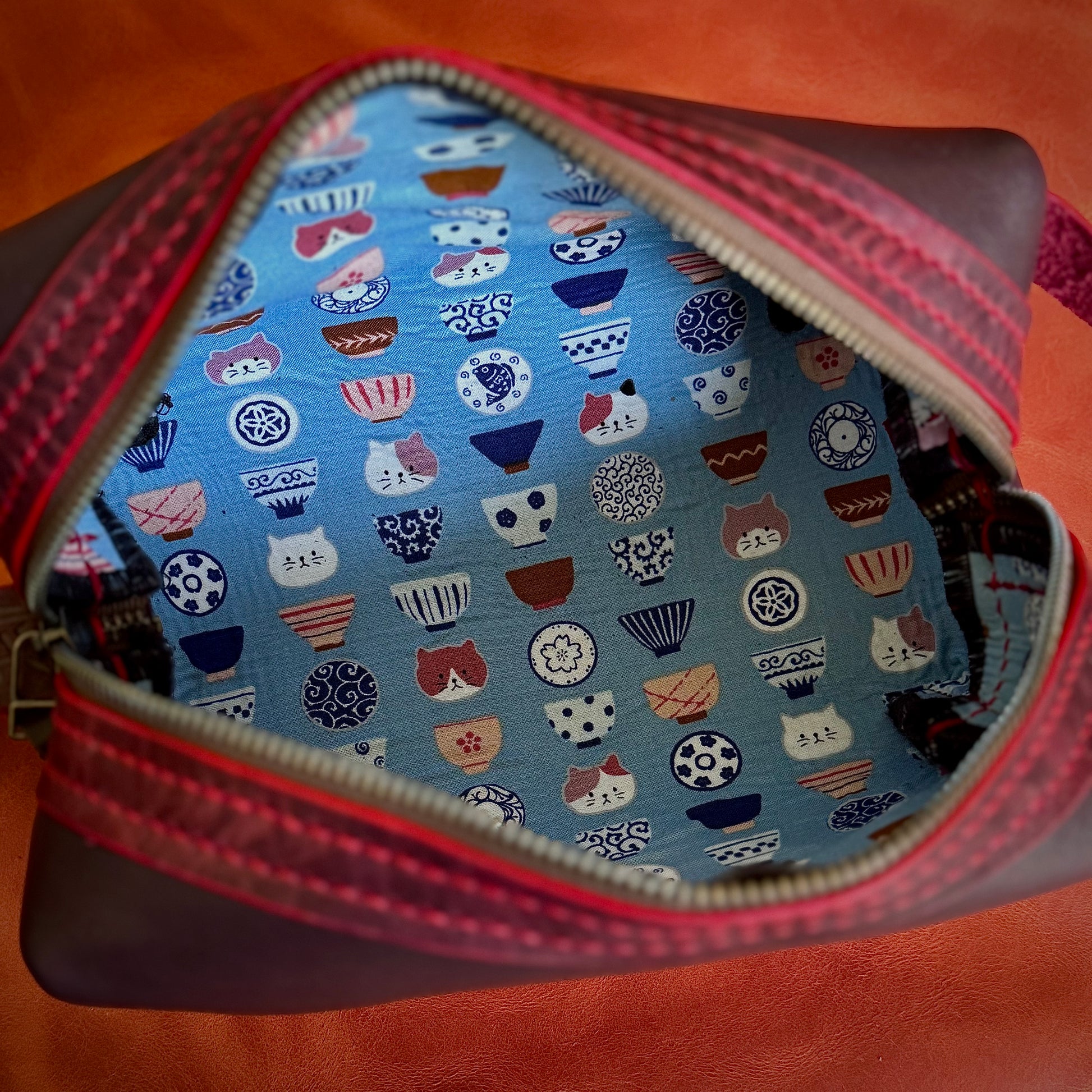 This is a handmade leather Dopp Kit featuring a Japanese Fabric liner.