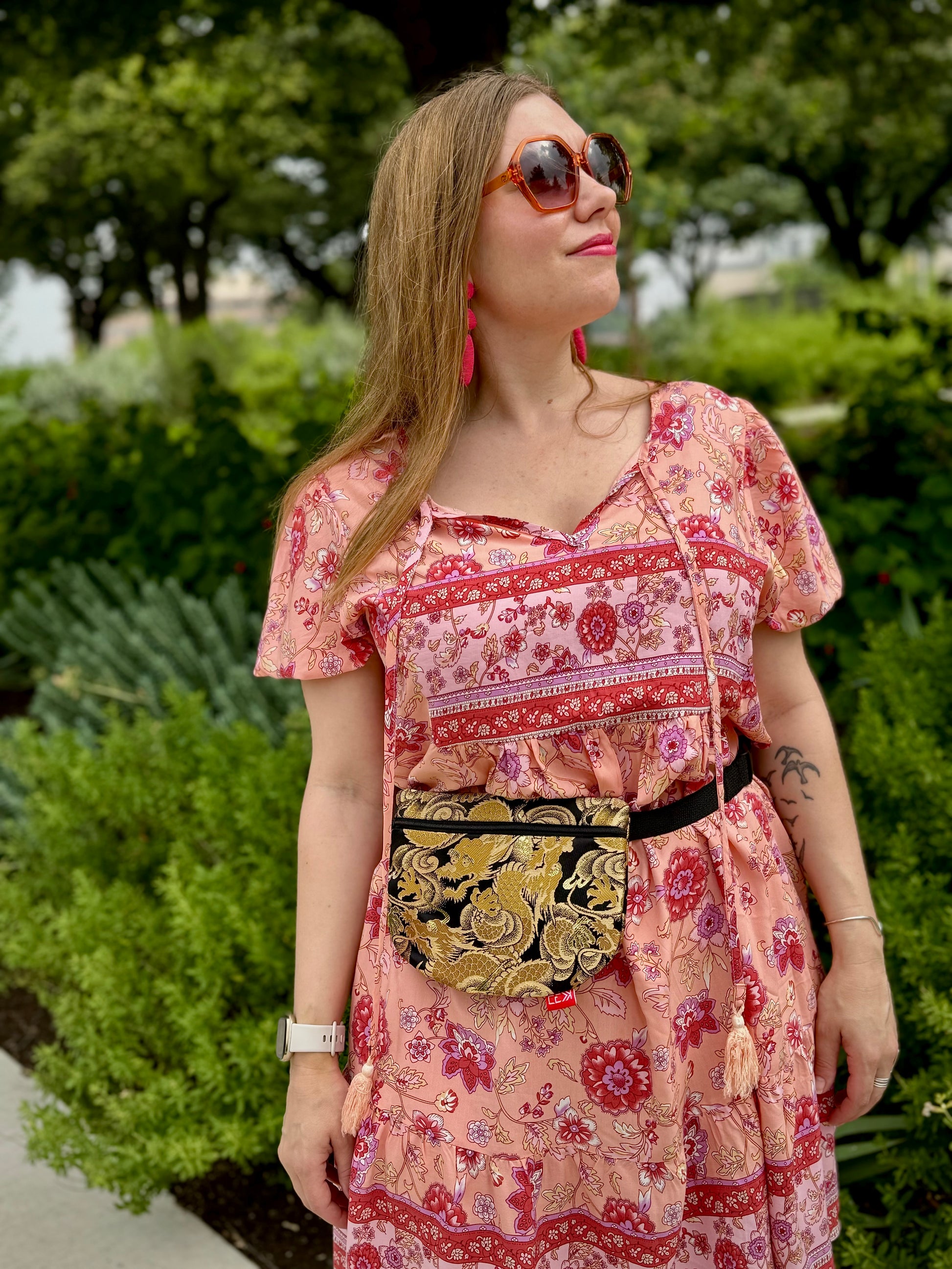 Kaiju Cut and Sew | Black and Gold Dragons Kimono Fabric Fanny Pack with built in 6 card slot wallet