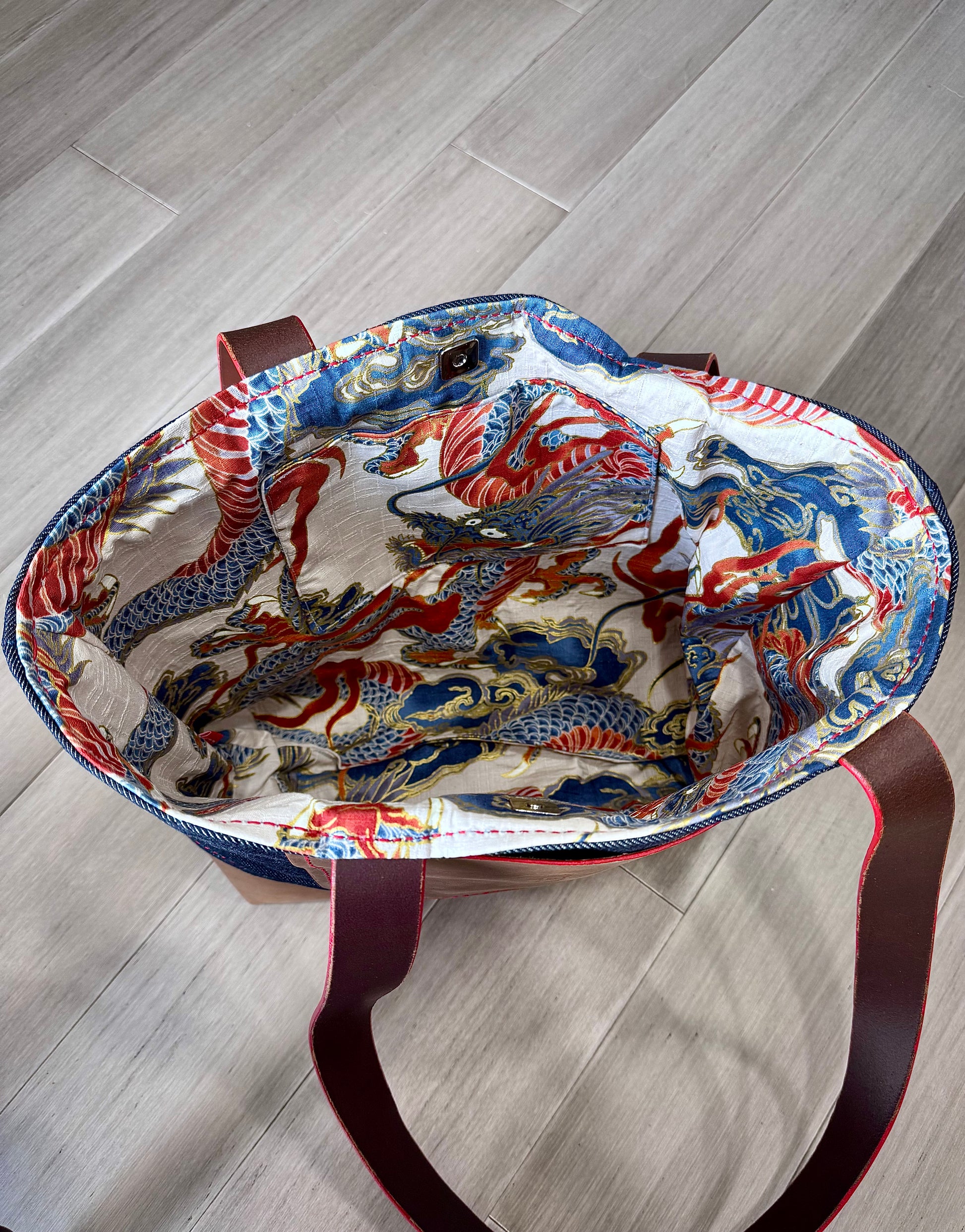 This is a large leather tote bag that features a Japanese interior fabric & Japanese Denim from Kyoto Japan.
