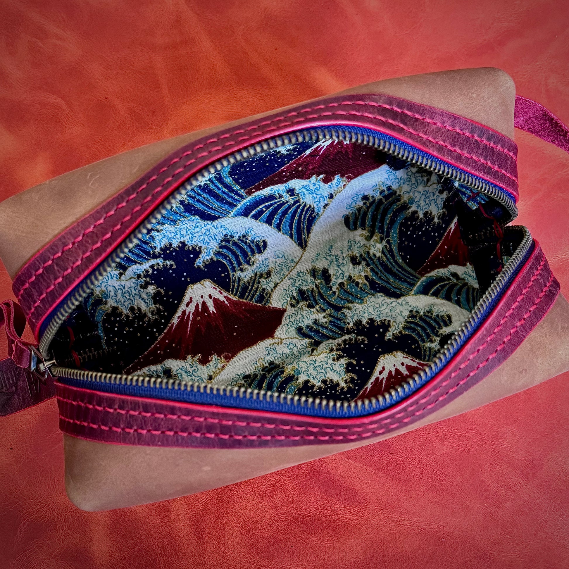 This is a handmade leather Dopp Kit featuring a Japanese Fabric liner.