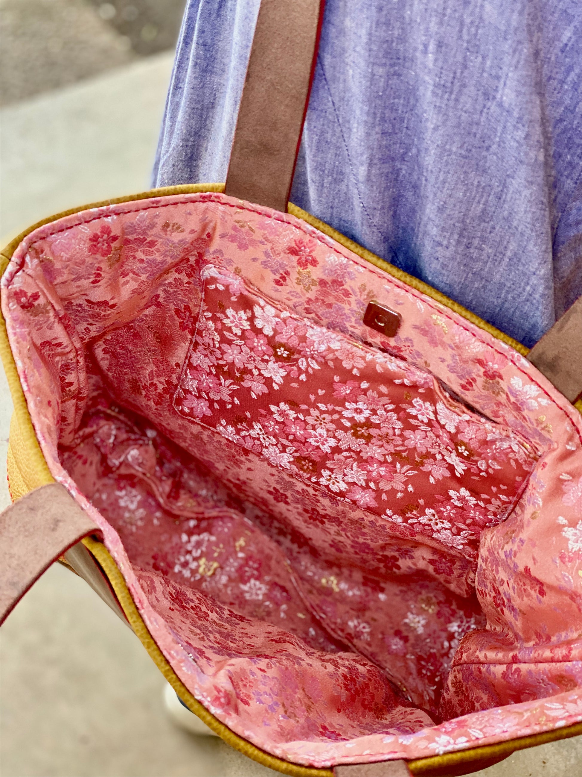 This is a large leather tote bag that features a Japanese Kimono interior fabric.
