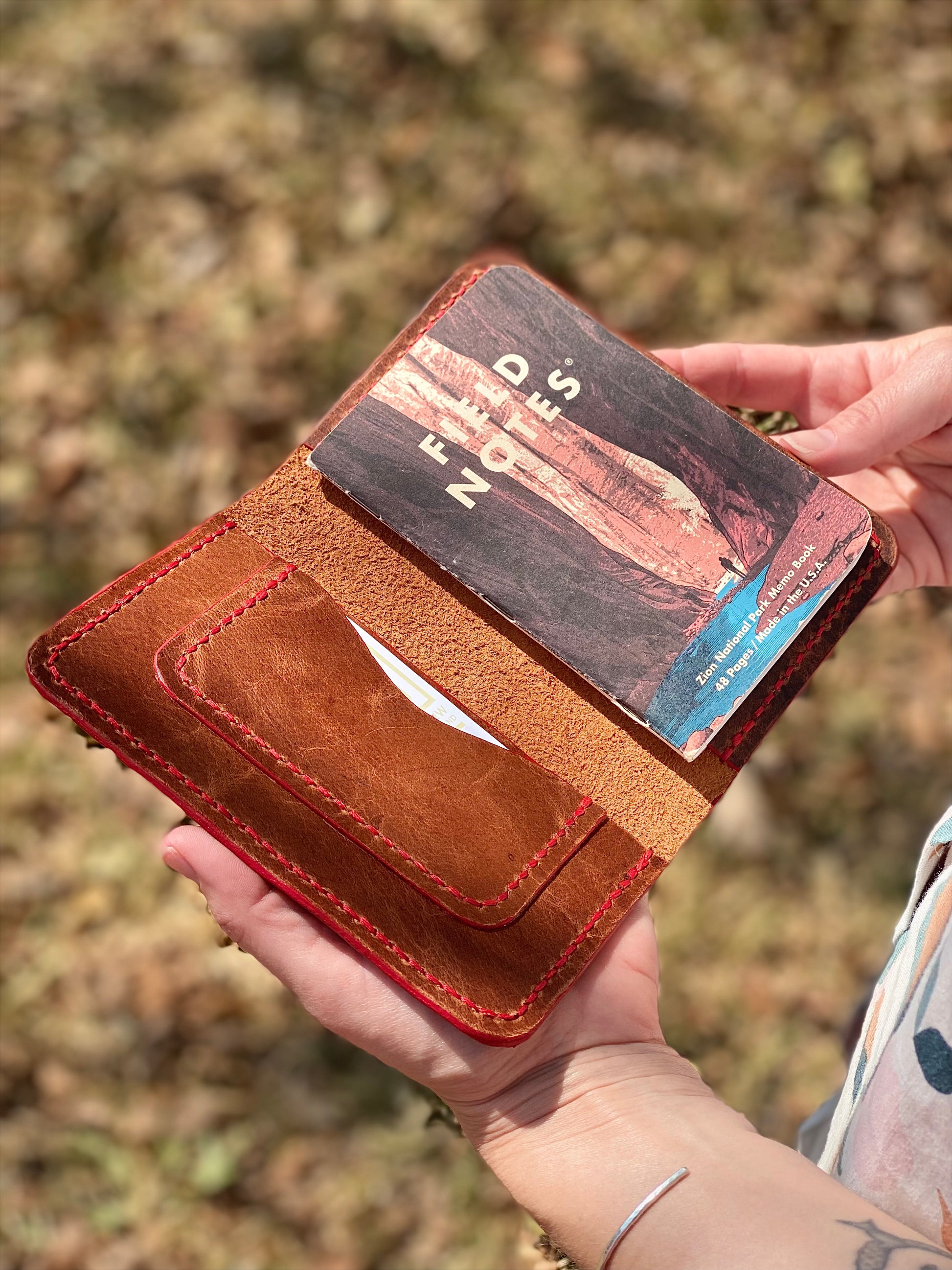 This is a handmade leather, Field Notes Cover with an interior Credit Card Pocket.
