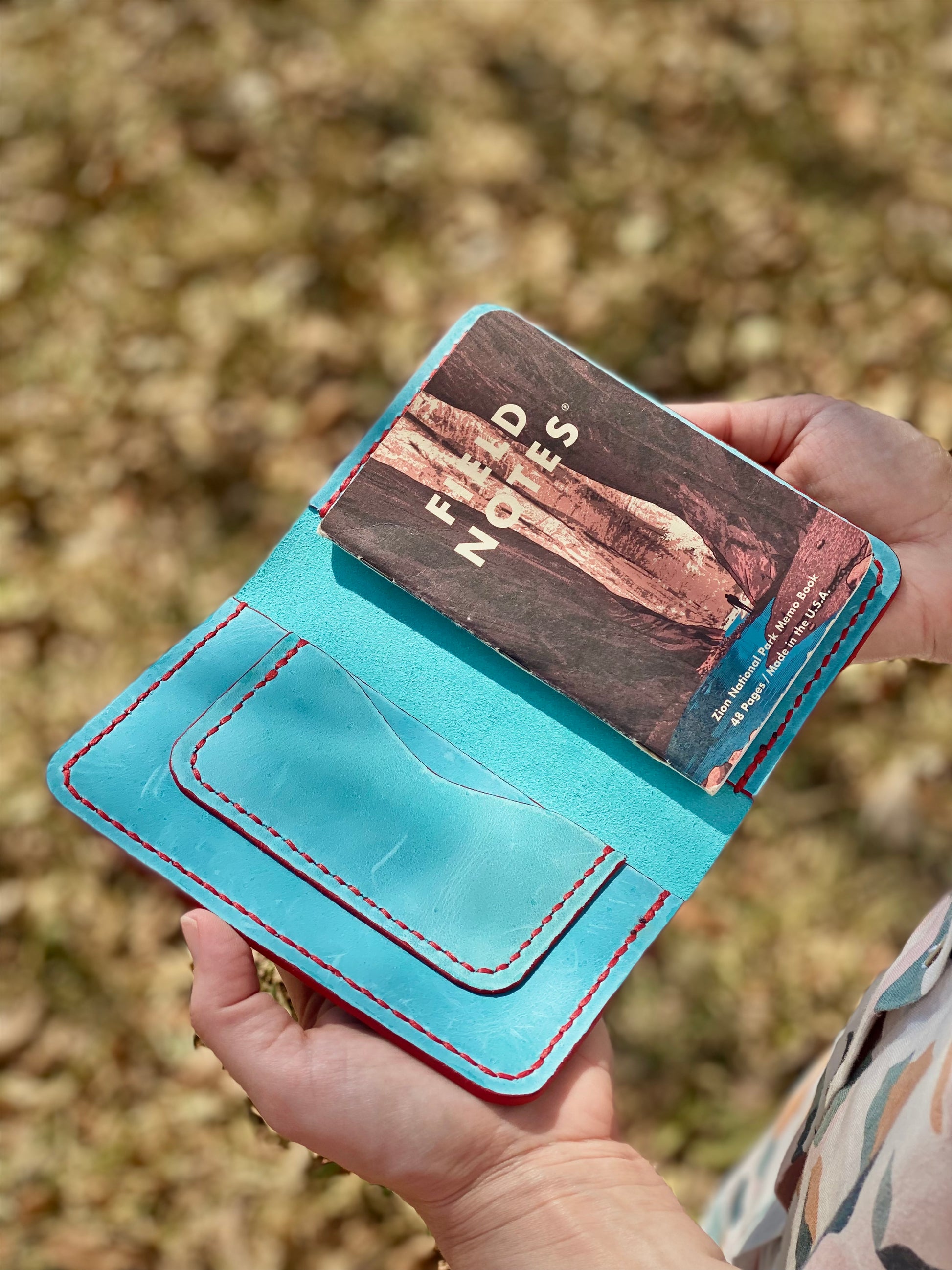 This is a handmade leather, Field Notes Cover with an interior Credit Card Pocket.