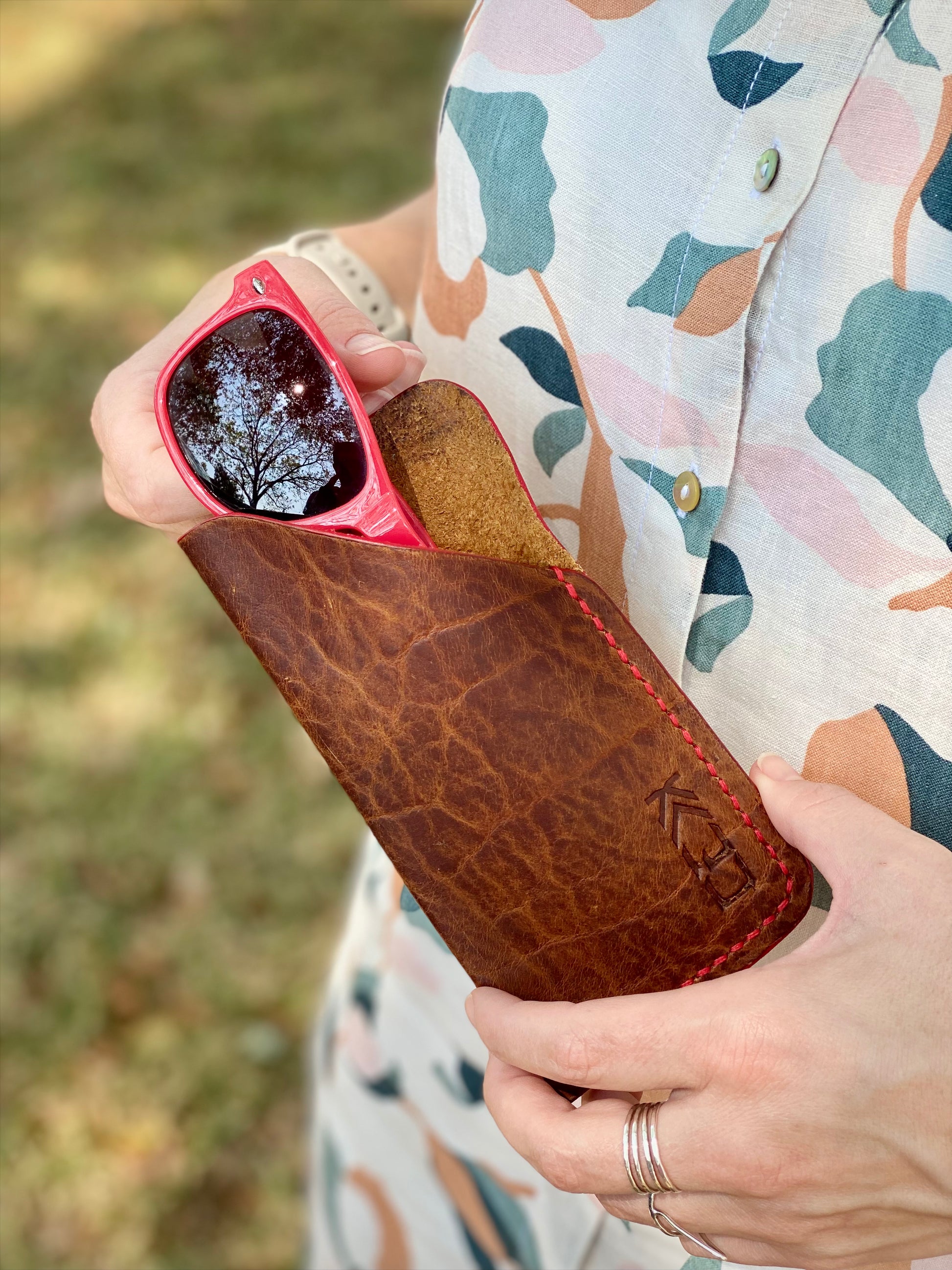 *Note* All of our leathers are created to wear/break in over time. Scratches and scars are inherent to this style of leather and add to the character and uniqueness of each sunglasses case.